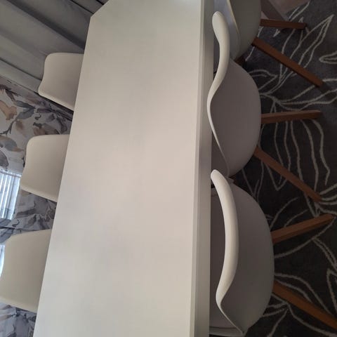 Jykevä ja tukeva mittojen mukaan teetetty ruokapöytä 175 x 95 cm + jatkopala 50 cm sekä kuusi tuolia.
