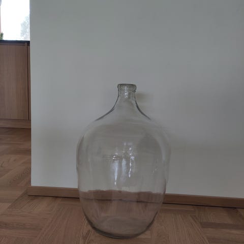 Ehjä lasipullo, jonka korkeus n. 60cm ja halkaisija n. 50cm.