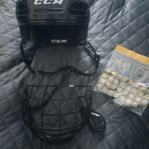 CCM Tacks 70 jääkiekkokypärä valkoisena, varustettuna metallisella kasvoristikolla. Kypärässä on säädettävä istuvuus ja leukahihna. Sopii jääkiekon pelaamiseen ja muuhun jääurheiluun, jossa tarvitaan pään ja kasvojen suojaa.