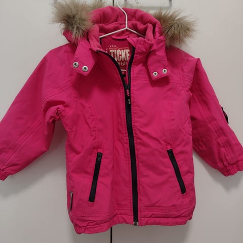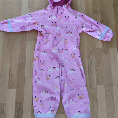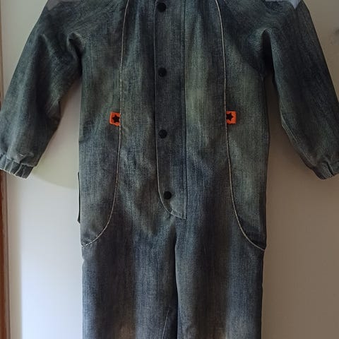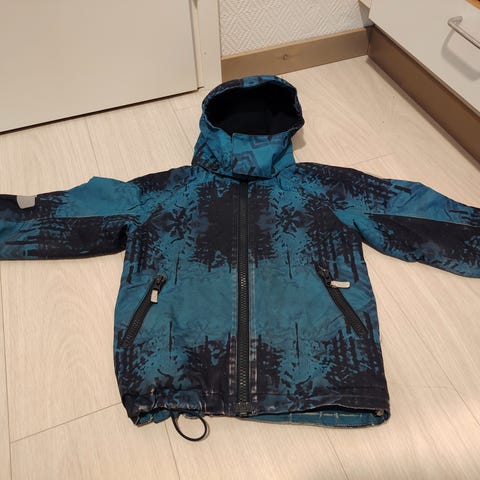 Annetaan yhden lapsen käyttämät 110 koon Reiman kurahousut. Edessä pienenpieni reikä, jonka huomasin syynätessä.