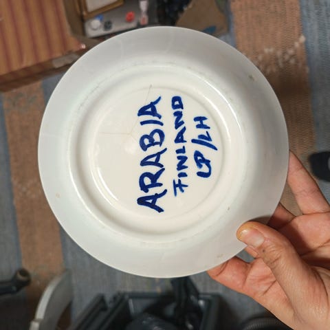 Arabia sinivalkoinen syvä lautanen, jossa keskellä maisemakuva ja reunassa kukkakoristekuvio. Materiaalina lasitettu keramiikka/posliini. Lautanen sopii esimerkiksi kattaukseen tai koristekäyttöön. Takapuolella on Arabian leima ja malli- sekä valmistusmerkinnät. Lautasia on 5 kpl. Vain nouto. Myynnissä muuallakin. Kulkeutuu kyllä Helsinkiin keskustaan. Yhteishintaan 60,- euroa