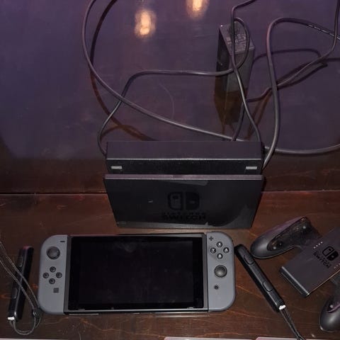 Nintendo Switch -pelikonsoli. Kannettava ja telakoitava pelikonsoli, jossa irrotettavat ohjaimet. Soveltuu sekä käsikonsolikäyttöön että televisioon liitettynä, riippuen mukana olevista lisävarusteista ja telakasta. Tukee Nintendo Switch -pelejä ja erilaisia moninpelitiloja ohjainmäärästä ja lisävarusteista riippuen. Muistikortti+laturi