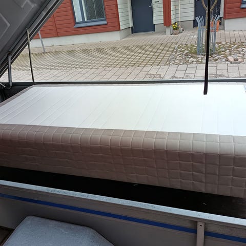 Runkopatjallinen sänky, jossa vaalea päällinen sekä puiset jalat. Kaupanpäälle tulee tummansininen puuvillainen patjansuojus