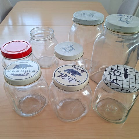 Riihimäen lasinen 5 litran purkki.