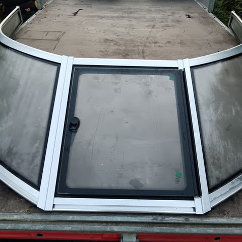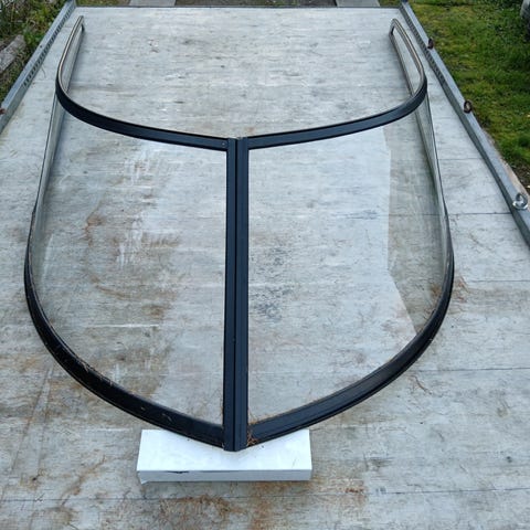 Veneen tuulilasi. Materiaali lasia. Leveys takaa alhaalta 120cm, syvyys 240cm ja korkeus 43cm. Vaatii keskelle eteen 10cm korotus palan. Voidaan myös vaihtaa alumiinivanteisiin, akkuihin yms. Mielenkiintoiseen. Edullinen rahti voi myös onnistua.