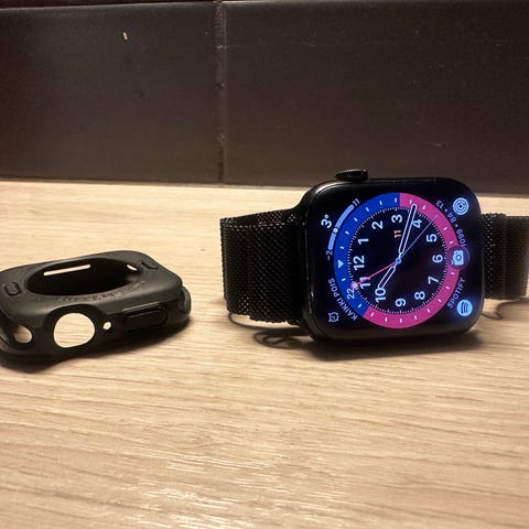 Myynnissä Apple Watch Series 9 GPS, 41mm. Mukaan latauskaapeli ja kaksi ranneketta.