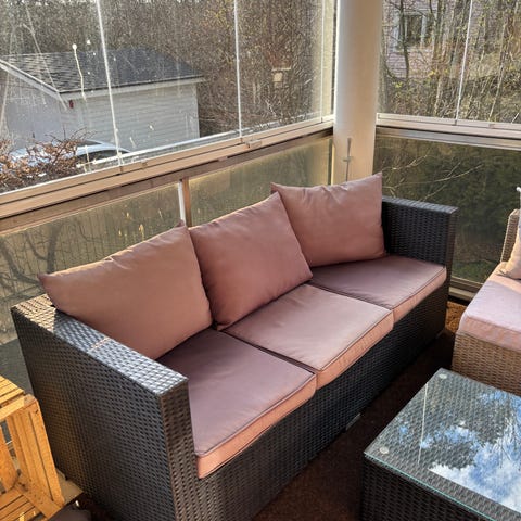 Kuvan sohva. Ollut talven ulkona peitteen alla. Ihan ok kunto. Kulutuksen jälkeä luonnollisesti on jonkin verran kun vanha sohva. Vähän putsausta vaatii...mutta hyvä ulkokäyttöön. Miksei sisällekin...Saa laitettua sängyksi. Täysin kuiva. Mahdollisimman pian haku. Ei sovellu nyt uuteen pihaan niin siksi pois. Menee ensimmäiselle jolle sovitaan haku. Parin päivän jälkeen lähtee kierrätykseen. Pitää saada pois uusien tieltä.