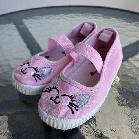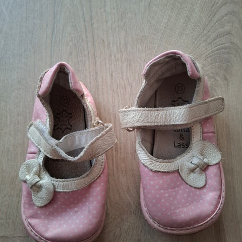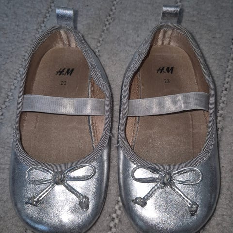 Tyttöjen käytetyt juhlakengät. Mustat ballerinat, joissa kuminauharemmi yli jalkapöydän ja edessä rusetit. Koko 23.