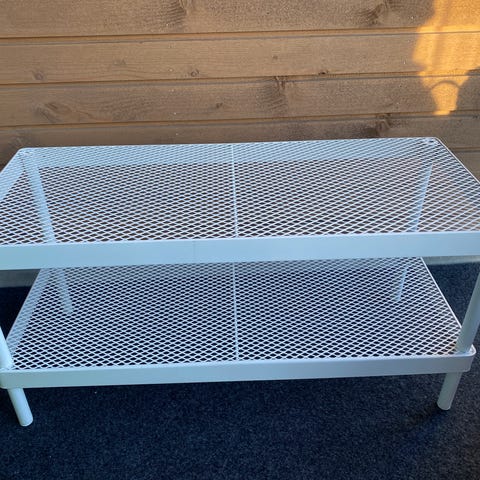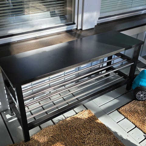 Metallinen kenkäteline, väri musta. Telineessä on useita rinnakkaisia metalliritilätasoja, jotka soveltuvat kenkien ja muiden jalkineiden säilytykseen. Avoin rakenne helpottaa kenkien tuulettumista ja puhdistamista. Sopii eteiseen, vaatehuoneeseen tai muuhun säilytystilaan lattialle sijoitettavaksi.