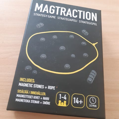 Klask on magneettinen taitopeli, jossa pelaajat ohjaavat pelinappulaa pöydän alapuolelta magneetilla ja yrittävät tehdä maaleja vastustajan päätyyn. (20€)