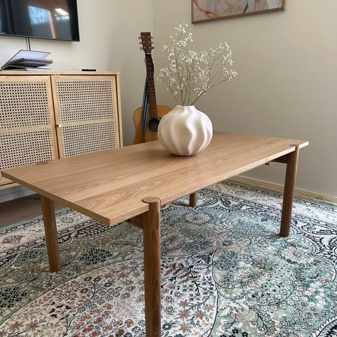 Pöytä on kestävä, tukeva ja painava. Ei heilu ei vapise. Käsitelty kestävällä ja turvallisella öljyllä joten pinta kestää kulutusta ja käsituntuma on pehmeä matta.