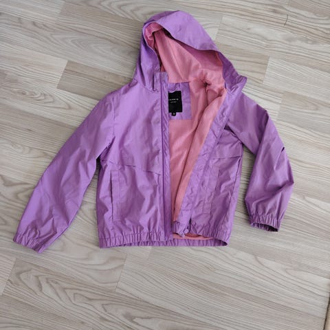 Exit-merkkinen puna-beigeruudullinen kesätakki koko 8/9 eli 130cm. Irrotettava huppu, hihansuissa resorit ja edessä taskut.