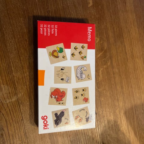 Helppo muistipeli pienille lapsille. 12 palaa, 6 paria. Kuvina kivat eläinhahmot. Puisten palasten koko 48 x 48 x 4 mm. Jonkin verran kulumaa, mutta tuskin haittaa pientä pelaajaa.