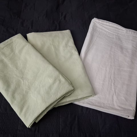 Kaksi sinistä aluslakanaa kooltaan n. 118cm x 175 cm. Kuva vääristää värin, oikeasti väri on sininen. Hyvä käytetty kunto.