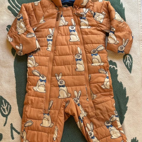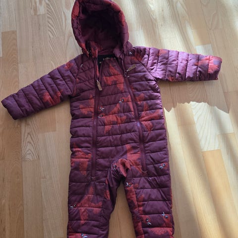 Ihana Mini Rodinin kevyttoppahaalari koko 80cm (meni myös 86). Irrotettava huppu ja käännettävät hihan- ja lahkeensuut. Pientä mustaa jälkeä (kuvassa) ja tummentumaa hihansuissa, yleisilme siisti. 10€.