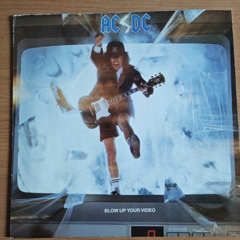 AC/DC Blow Up Your Video vinyylilevy. Rock-albumi julkaistu Atlantic Records -levymerkillä. Levyllä on useita kappaleita, jotka on jaettu kahdelle puolelle. Formaattina on 12" LP-vinyyli stereona. Kansi sisältää albumin kuvituksen sekä kappalelistan ja muuta julkaisun perustietoa.