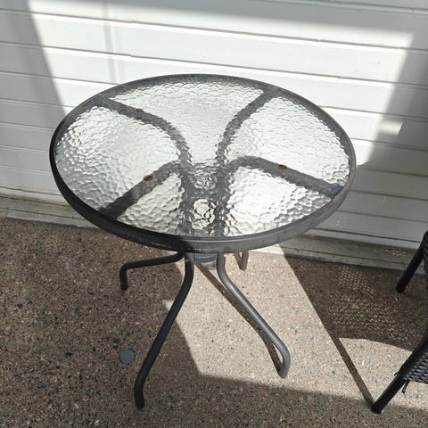 Pyöreä taitettava teräspöytä parvekkeelle tai terassille. Pöydässä on metallirunko ja pyöreä kansi, väri vaalea vihreä. Taittomekanismin ansiosta pöytä on helppo säilyttää pienessä tilassa. Soveltuu ulkokäyttöön esimerkiksi lisätasoksi istuinryhmän yhteyteen. Rustasta ostettu pari vuotta sitten ja nyt turhaksi jäänyt.