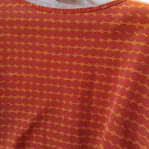 Mekko on oranssia puuvillakangasta, jossa on toistuva graafinen kuosikuvio. Pitkähihainen, materiaali on puuvillaa, joka on miellyttävä ja hengittävä käytössä.