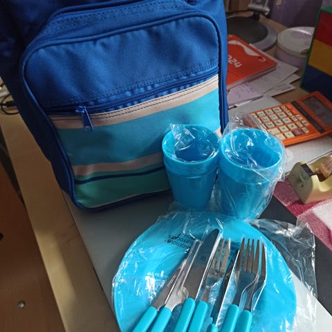 Kuvan piknik astiasto kaikkia 4kpl ja laukussa kylmä kassi samassa ja astioille oma puoli.