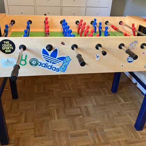 Myydän pöytäfutis ja kääntöpuolella jääkiekko. Hieman ruostetta tangoissa ja reunasta repsottaa. Jääkiekon yks ukkeli ei pyöri. Muuten toimiva. Mukana 2 pallo ja yksi kiekko. Mitat: leveys 64cm, pituus noin 113cm ja pelikorkeus noin 90cm