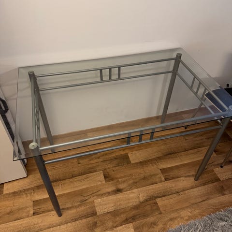 Lasinen kirjoituspöytä metallirungolla