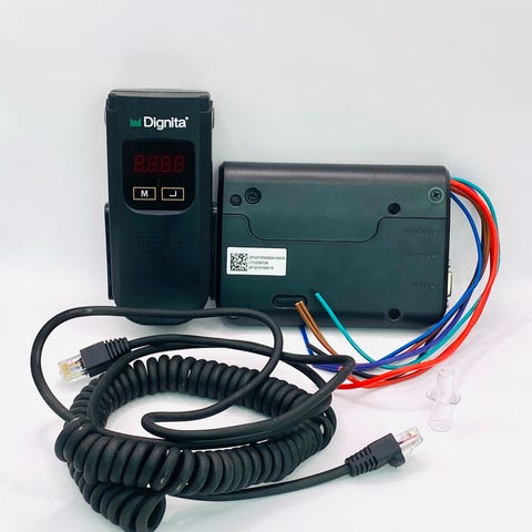 Dignita alkolukko ajoneuvokäyttöön. Mukana käsilaite, johon on integroitu näyttö ja painikkeet, sekä erillinen ohjainyksikkö ja johtosarja asennusta varten. Laite mittaa uloshengitysilman alkoholipitoisuutta ja voidaan liittää ajoneuvon sähköjärjestelmään alkolukoksi. Vähäisellä käytöllä ollut, ovh 1300e