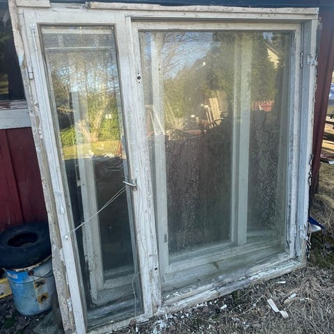 Harmaa puukarmi ikkuna jossa ulkopuolella alumiinilista. 4 kappaletta kooltaan 110 x 165 cm karmeineen ja 2 kappaletta 120 x 177 cm karmeineen. Hinta 25 euroa kappale.