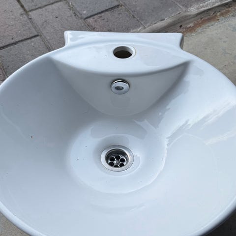 Valkoinen posliininen Svedbergs pesuallas ja kromattu Newform hana