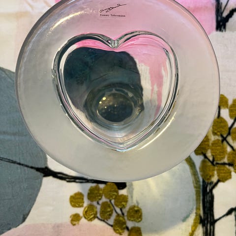 Muurlan lasinen sydänmaljakko. Kirkkaasta lasista valmistettu jalallinen maljakko, jonka yläosassa on sydämen muotoinen syvennys. Sopii esimerkiksi kukkamaljakoksi tai koriste-esineeksi sisustukseen. Käyttämätön, alkuperäispakkauksessaan.