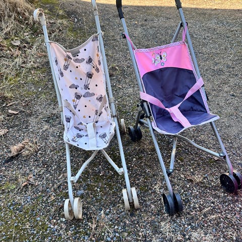 Hyväkuntoiset, kokoontaitettavat nuken rattaat.