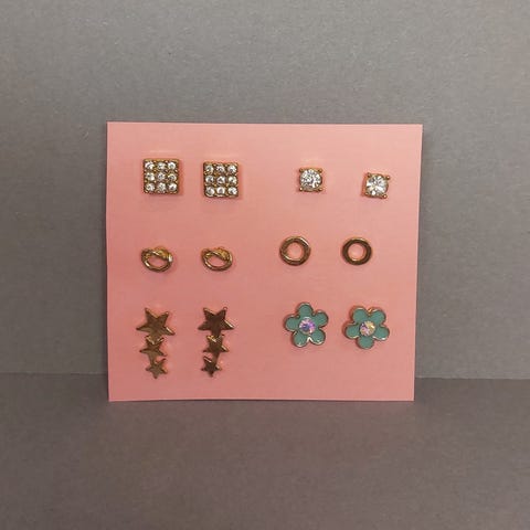 4 kpl käyttämättömiä korvakoruja. Pienimpien korujen halkaisija 0,6 cm ja isoimpien korujen halkaisija 1,8 cm.