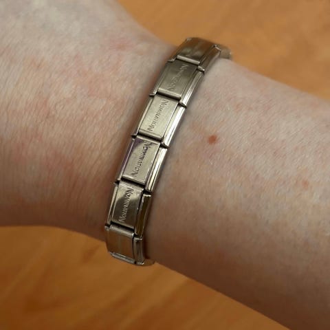 Nomination rannekoru, kaikki palat tallessa (kaksi ollut irroitettuna omassa käytössä). Hyvässä kunnossa, läheltä katsoessa pieniä käytön jälkiä.