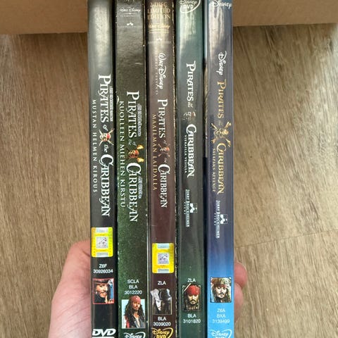 Pirates of the Caribbean -elokuvasarja, yhteensä neljä DVD-levyä alkuperäisissä koteloissaan. Paketti sisältää neljä sarjan elokuvaa, jokaisella oma kotelonsa ja levynsä. Elokuvat ovat DVD-muodossa ja sopivat DVD-soittimille. Takakansista löytyvät tarkemmat tiedot kielistä, tekstityksistä ja lisämateriaalista. Soveltuu kokoelmaksi tai katsottavaksi toimintaseikkailuelokuvista kiinnostuneille.