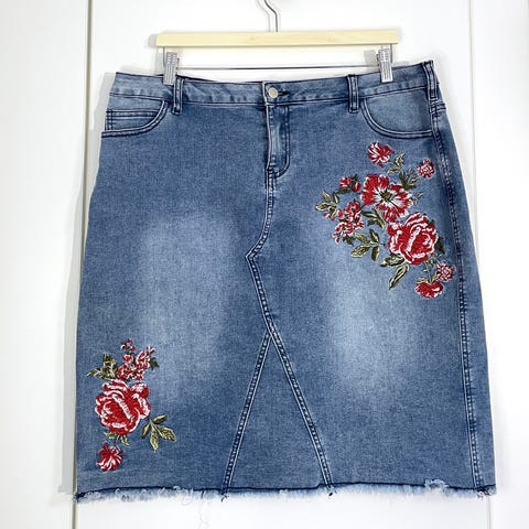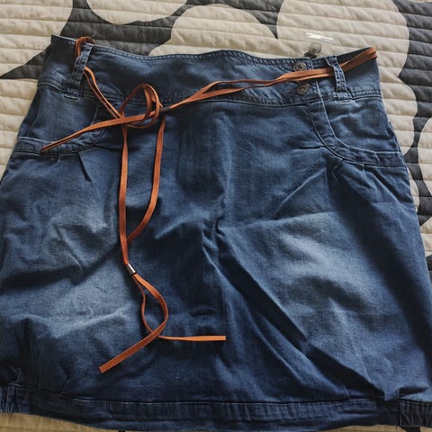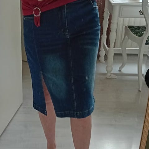 Käyttämättä jäänyt elastaania sisältävä kynähameen mallinen farkkuhame. Kokomerkintä 44, mutta väljää mitoitusta. Osittain joustovyötärö. Vetoketju on tosi jäykkä, mutta toimii.