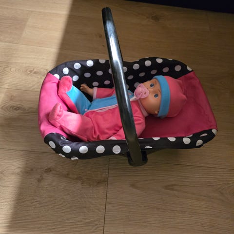 Kauniit, kolme, siistiä nukkea, vaatteineen, sekä, nuken kehto.