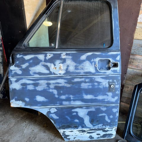 Vanin hyvät etuovet. Kuskinpuolella sisäpuolella alareunassa pieni reikä.