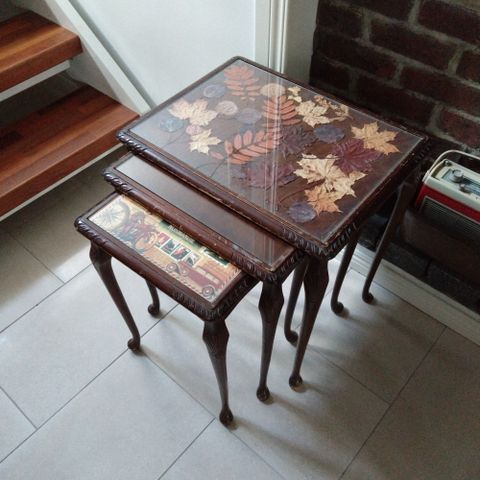 Hyvin säilynyt, kaksiosainen sarjapöytä, joka on valmistettu aikoinaan Suonenjoella olleessa, laadukkaasta työstään tunnetusta J Kutvosen huonekalutehtaassa. Aivan pientä naarmua pinnassa, jotka sen verran huomaamattomia etteivät haittaa siistiä kuntoa. Pinnat ovat niin kiiltäviä etten saa kuvattua kunnolla heijastusten vuoksi. Isomman pöydän koko 66 x 50 x 55(korkeus) cm. Pienempi 52,5 x 46 x 52,5 cm. Menevät sujuvasti sisäkkäin, mutta voi käyttää myös erillisinä pöytinä. Nouto tai kuljetus lähialueelle pientä maksua vastaan.