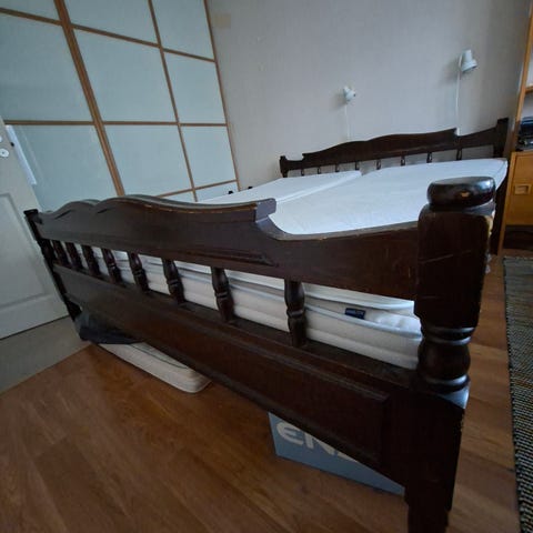 Iskun umpipuuta oleva koivusänky 160x200cm, ja samaa sarjaa yöpöydät 50x40x60cm (+sängyn korkeus n. 60cm patjojen kanssa). Kaupan päälle Ikean Sultan Hamnö Tuvebo runko- ja sijauspatja, jotka hyvässä kunnossa. Myydään mielellään pakettina, mutta voi tarjota myös erikseen. Nopeat noudot etusijalla.