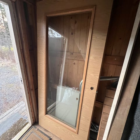 Forssan metallityön valmistama palo-ovi. Ovi on siisti, muutamat ruuvin reiät ovenkahvasta sekä sähkölukkolukijasta jäänyt.