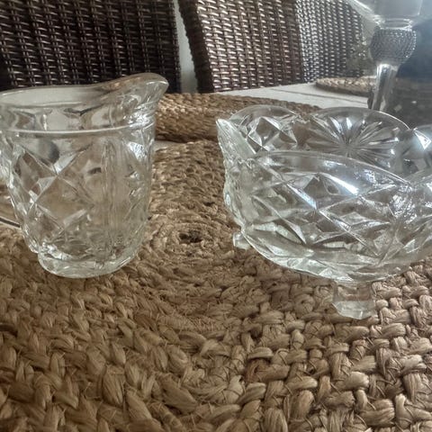 Kristalliset sokerikko ja kermakko. Kermakon korkeus noin 6 cm, halkaisija 7 cm. Sokerikko 5 cm korkea, halkaisija 8,5 cm. Nouto tai postitus.