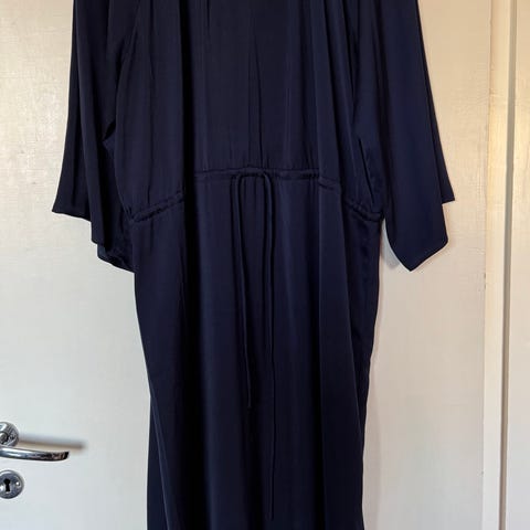 House merkkinen juhlamekko kokoa 46. Tummansininen pohjaväri ja vaalea kukkakuosi. Materiaalina polyesteri. Hihaton malli, takana nappikiinnitys pääntiellä, sivulla vetoketju, vuoritettu. Kai-kai 57cm ja pituus 97cm. Sopii arkeen ja juhlaan.