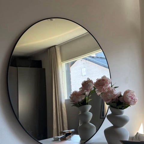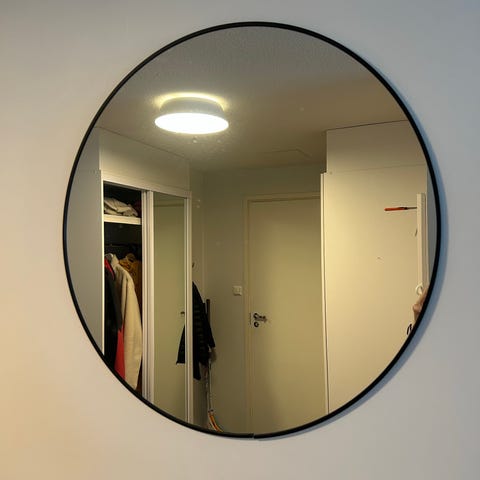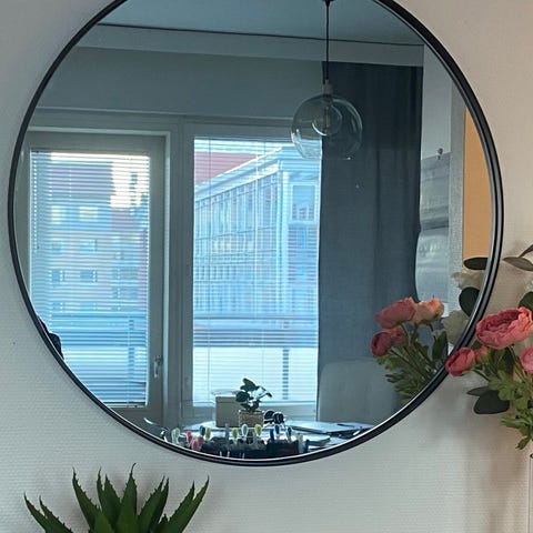 Rusta pyöreä peili mustalla kehyksellä. Peili sopii esimerkiksi eteiseen, makuuhuoneeseen tai olohuoneeseen seinäpeiliksi. Yksinkertainen ja pelkistetty muotoilu, joka käy monenlaiseen sisustukseen. Halkaisija 85cm.