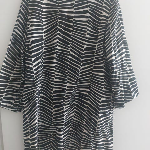 Marimekko Jannika Pieni Pioni paita/lyhyt tunika. Koko 44, kai-kai 57cm, olka-helma 82cm. Puserossa on mustavalkoinen Pieni Pioni -kuosi, pitkät hihat ja edessä halkiollinen pääntie nepparikiinnityksin. Mmm.