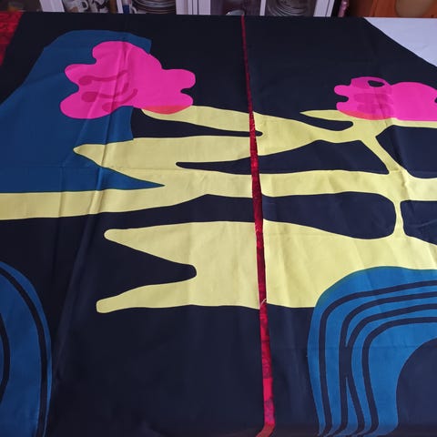 Ihana TORSTAIN kaupunki kankaasta ommeltu verhokappa. Kangasta on levennetty sinisellä silkki tai nylon kankaalla. Tässä aarre jollekin torstai fanille. Kapan pituus on 157cm. Torstai kankaan korkeus on 60cm, sinisen kankaan kanssa se on 114cm.