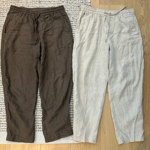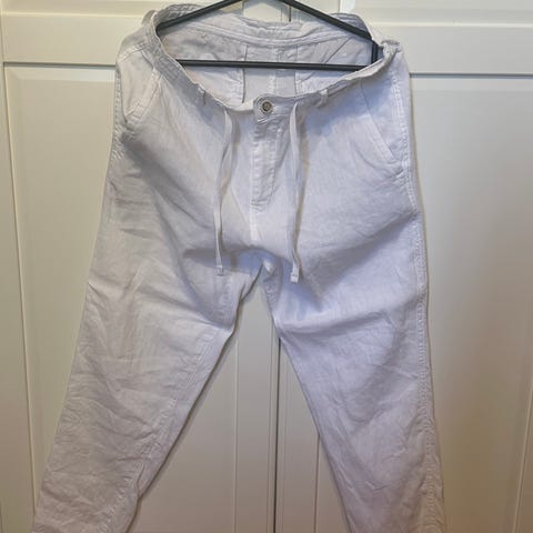 Erittäin hyväkuntoiset pellavahousut miehille, koko M. Housuissa on etukiinnitys napilla ja vetoketjulla sekä kiristysnyöri vyötäröllä. Takana on taskut. Kuvassa ovat juuri pestyt muttei silitetty.