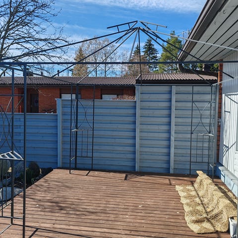 Paviljonkin kattokankaassa muutama repeämä kankaassa. Tuli viime keväänä kun koottiin paviljonkia. Paviljonkin kattokangas ei ole haurastunut vaan väkisin laittaessa repeytyi niistä kohdista mitkä joutui liian piukealle.