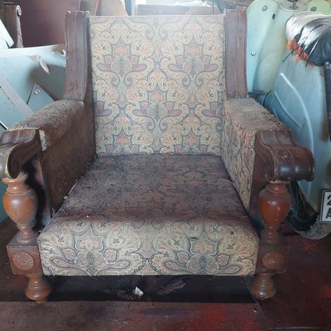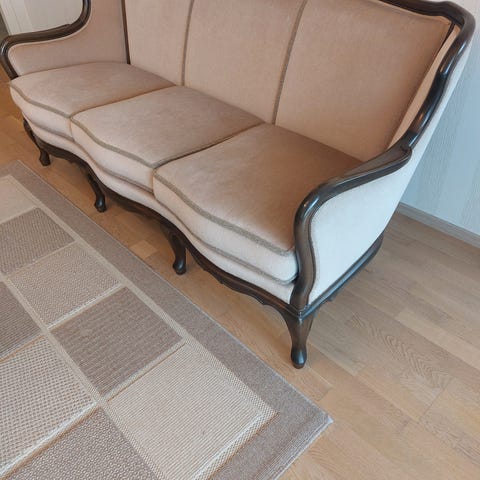 Myydään erinomaisessa kunnossa oleva kalusto. Siihen kuuluu kolmenistuttava 185cm levyinen sohva, ovaali sohvapöytä (105cm) sekä kaksi nojatuolia ja neljä tuolia ilman käsinojia. Asiantuntijan arvion mukaan ehkä 1880-luvulta ja valmistusmaa Ranska.