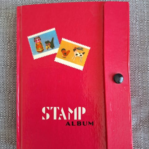 Postimerkkikansio. kork. 22 cm. lev. 16 cm. sivuja 8 ovat kaksipuoleisia. merkit ovat leimattuja. Kansiossa puolet Suomalaisia ja toinen puoli Ulkolaisia. Osa Suomalaisista merkeistä vähän vanhempia. Nouto.
