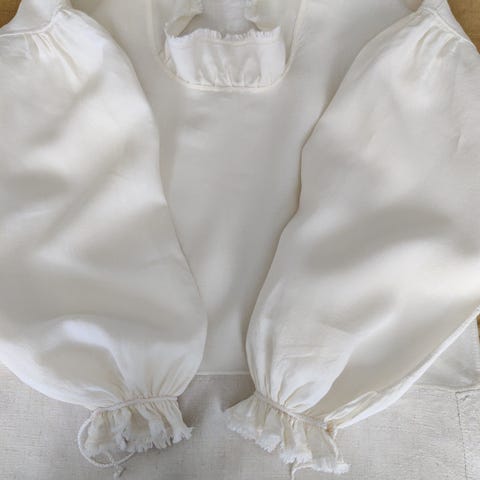 Esiliina on puolivalkaistua pellavaa, käsin valmistettu. Laskostettu osuus on 34 cm ja esiliinan pituus 81 cm.