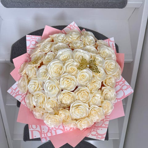 This unique eternal bouquet is crafted with premium satin ribbon, featuring a beautiful mix of red, pink, and white roses, decorated with delicate golden butterflies. Each flower is handmade with care.